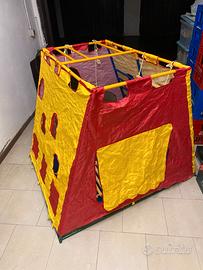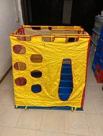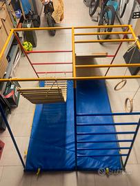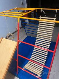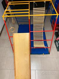 Palestrina per bambini da interno/esterno struttura completamente in metallo smontabile. Accessori modulari, si può cambiare disposizione in base all'età del bimbo: Scivolo, Ponte Tibetano, Anelli. In più copertura che la rende "la tenda degli indiani. Cuscino che fa da fondo. Gli accessori sono totalmente in legno, la struttura in metallo può essere smontata (sono aste ad incastro rapido) ed occupa pochissimo spazio. Ritiro a mano a Brescia, oppure spedizione indicativamente 40-50.