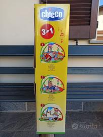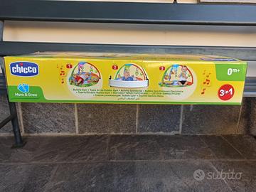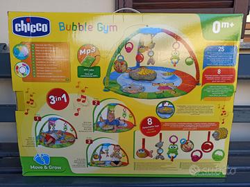 Chicco Bubble Gym e dotata di un tappeto imbottito di grandi dimensioni e dai colori brillanti, un morbido cuscino e 3 archi gioco con pannello elettronico con cui personalizzare musiche, suoni ed effetti luminosi.