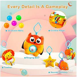 ??Tanti Giocattoli Bonus in dotazione?In aggiunta al morbido tappetino da attività per i neonati, ci sono anche molti bonus: 5 sonagli e giocattoli per la dentizione, 30 palline di gomma, una casetta con carta crespa sensoriale sul tetto. Tutto questo attirerà i bambini che si divertiranno da soli per tutto il giorno. Godetevi il vostro momento di palestra!