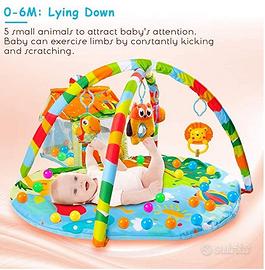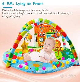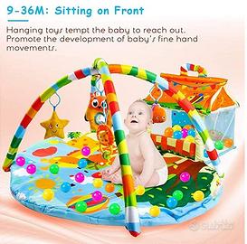 ??4 modi di giocare mentre il bambino cresce?0-3 mesi: Sdraiato per esercitare gli arti scalciando e allungandosi costantemente. 4-6 mesi: Sdraiato sul davanti per migliorare la forza del collo, delle spalle e della schiena durante il gioco. 6-9 mesi: Seduto sul davanti per favorire lo sviluppo dei movimenti delle mani. Più grande: Esplorazione sensoriale con i giocattoli bonus.