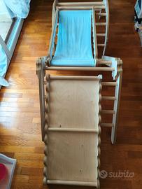 Composta da 4 elementi modulabili e multifunzione: lo scivolo è anche una scaletta, il semicerchio è sia una scaletta curva che un dondolo, il triangolo ha diverse angolazioni. Il tessuto dell'amaca è lavabile. Usata da un solo bambino.