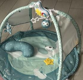 Il soffice tappeto ha grandi dimensioni (83 cm diametro) ed è dotato di un cuscino morbido ergonomico, ideale per giocare a pancia in giù o da seduti; tappeto, cuscino e giochi in tessuto sono lavabili in lavatrice