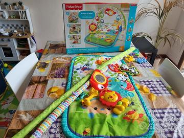 Il vostro bambino può giocare sdraiato a pancia in su, a pancia in giù o da seduto, sul tappetino imbottito che potrete portare ovunque. La musica attiva fino a 10 minuti nella modalità attivazione prolungata. Volete offrirgli un po' di varietà? Nessun problema, cambiate la posizione dei giocattoli e il vostro bambino godrà di una visuale completamente nuova.