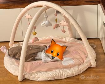 Colore rosa/pesca con base morbida e imbottita, completa di due archetti incrociati e giochini sospesi (stelline, arcobaleno e nuvoletta).