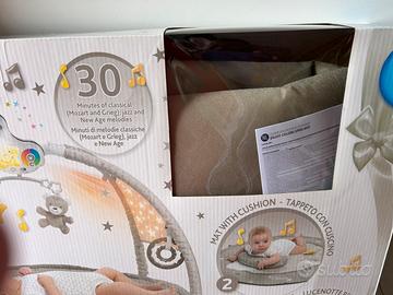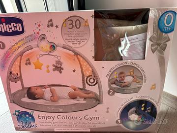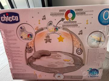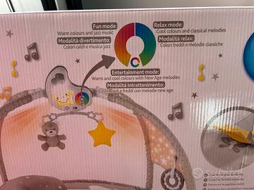 Palestrina Chicco per i primi mesi del tuo bambino. Offre diverse modalità di gioco e musica. - Modalità Fun: colori caldi e musica jazz. - Modalità Relax: colori freddi e melodie classiche. - Modalità Entertainment: colori caldi e freddi con melodie new age. - Include giochi pendenti come un orsetto e una stella. - Presenta un proiettore luminoso con diverse luci colorate.