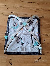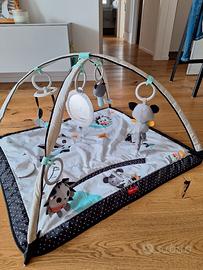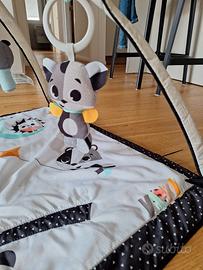 PICCOLI AMICI: il tappeto gioco è dotato di personaggi dagli occhi grandi e sorridenti e di giocattoli stimolanti: un gioco di peek-a-boo, una giostrina acchiappasogni, una nuvola di peluche, una morbida volpe sonaglio, un libro morbido in tessuto, un massaggiagengive e uno specchio.