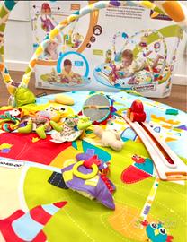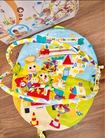 Questo oggetto è una Palestrina Yookidoo Gymotion Activity Playland, un centro attività evolutivo per bambini progettato per accompagnarli dalla nascita fino ai 12 mesi. Caratteristiche principali: Include una macchinina motorizzata che scorre su un binario sospeso, attivandosi con il movimento e riproducendo musica. Fasi di gioco: È adatta per le fasi disteso (supino), pancia in giù (tummy time) e seduto. Accessori: È dotata di un tappetone lavabile, archi rimovibili e vari personaggi sospesi come un principe, una principessa e un drago.