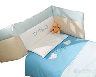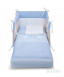 Lettino per bambini con dimensioni ridotte Misure esterne: 109P x 57L x 96H cm, si rivela adatto anche negli ambienti meno spaziosi - Struttura in legno di faggio - Sponde regolabili - Rete ortopedica a doghe di legno - incluso materasso e set 3 pezzi completo lettino Pali City composto da paracolpi, piumone e copricuscino colore azzurro.