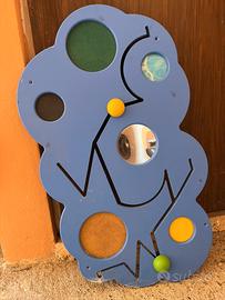 NUVOLA IN LEGNO PER IL TATTO E IL PREGRAFISMO Dimensioni pannello 85 x 1, 8x 50h. Perfetta per arredare nidi, sale giochi o camere per bambini. Pannello in multistrato di betulla favorisce lo sviluppo delle capacità visive, motorie e tattili. Necessari i tasselli per il fissaggio al muro. Piccolo difetto come da foto