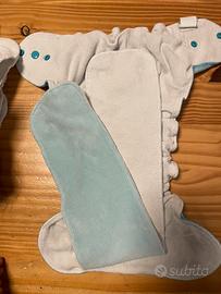 Pannolini lavabili petit lulù taglia unica, con inserti in bamboo e cotone, 5 cover di cui 3 con velcro e 2 con bottoncini, piu 5 inserti di ricambio (due con anche il boost lungo e tre senza). Le cover hanno gli elastici un po allentati. Gli inserti sono in buone condizioni, uno presenta dei segni di usura. Questo assetto è perfetto come assetto notturno, super assorbente. Vestono grande quindi anche nella taglia più piccola non vanno bene per neonati piccolini.