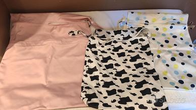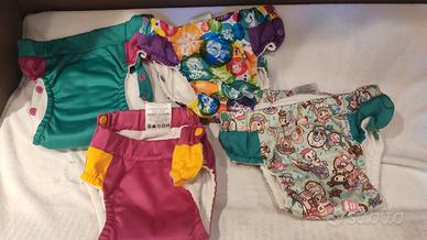 Vendo intero parco pannolini lavabili così composto : 4 pocket di marca Little Lamb, bumgenius, Mommy mouse con relativi inserti e booster - 4 all in One di marca groovia, bumgenius, blumchen - 7 pocket cinesini corredati di inserti certificati di marca hu-da, thirsties tutti in misto cotone, bambù iper assorbenti - 4 mutande contenitive di marca certificata kangacare ottime anche come costume contenitivo dai 2 anni - 3 sacchetti per i cambi di cui 1 a marchio Little Lamb con doppio scompartimento per i pl puliti e sporchi estremamente comodo ed utile. Attenzione *regalo* 3 pannolini all in One marca blumchen perché il tessuto interno in bambù è consumato ma sono assolutamente validi ed ancora sfruttabili e 4 estensori per body Attenzione i 2 all in One di marca bumgenius hanno gli elastici leggermente allentati, nonostante ciò noi li abbiamo usati con successo. Tutto è perfettamente ben conservato e senza aloni. Il prezzo è leggermente trattabile. NB La taglia è indicativa, perché si possono usare dalla nascita fino allo spannolinamento