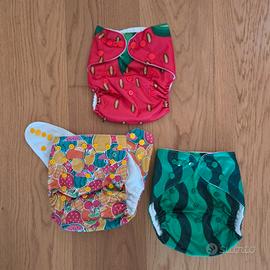 Set 3 pannolini lavabili, tema estivo: un'anguria, una fragola e frutta tropicale. Usati pochissimo