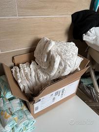 Sono 2 confezioni da 24 pannolini taglia 1 più circa 30 pannolini taglia 1 sfusi e 38 taglia 2 sfusi, margine di errore di 1-2 pannolini perché non ho tempo di contarli con attenzione vista la situazione attuale.