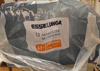 Confezione da 12 pannoloni mutandina Esselunga. - Taglia grande (100/150 cm, +70 kg). - Sistema anti-odore. - Clinicamente testati. - Totalmente traspiranti. - Ipoallergenici.