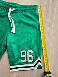 Pantaloncini sportivi verdi per bambino. - Tessuto in rete traspirante. - Numero 96 applicato sul lato. - Fascia elastica in vita con laccetti bianchi. - Bordi a contrasto bianchi e neri.