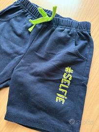 Pantaloncini da bambino in cotone blu. - Vita elasticizzata con laccetti verdi. - Tasche laterali. - Stampa #SELFIE laterale.