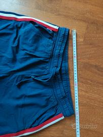 Pantalone corto bambino, taglia anni 12, laccetto ed elastico in vita, Larghezza cm 30, lunghezza cm 40. Con due tasche laterali. Colore blu e due bande laterali colore rosso e bianco. Euro 1.