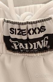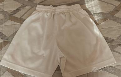 Pantaloncini sport per bambino, marca Spalding, colore bianco con logo rosso ricamato, 100% poliestere.