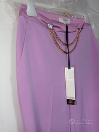 Pantalone regular in tessuto tecnico Fracomina prezzo di cartellino € 129,00 Pantalone regular in tessuto tecnico, vita alta con catene gioiello, tasche laterale, e con fondo dritto. Composizione Poliestere 89% elastina 11% Colore lilla