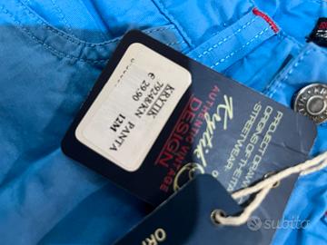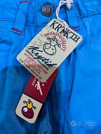 Pantaloni per bambino, taglia 9/12 mesi. - Colore blu vivace. - Dettagli con cuciture rosse. - Etichetta del marchio KRAYTIK. - Patch con la lettera 'B' sul taschino.
