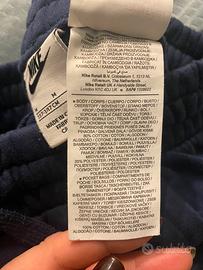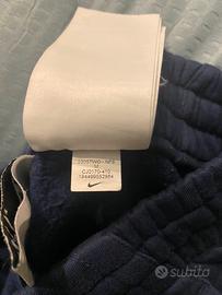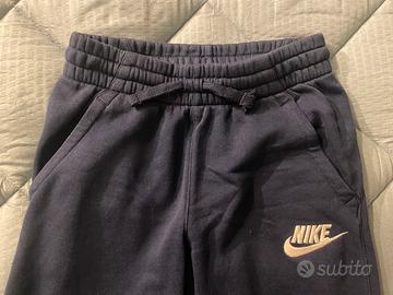 Pantaloni felpa Nike unisex per bambini/e cm 137-147 cm (età 9-11 anni) colore blu marino con logo bianco su una gamba, tasche laterali. Fascia elastica in vita con coulisse e polsini elastici alle caviglie. 80% cotone, 20% poliestere. In ottime condizioni.