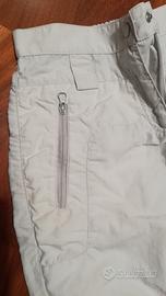Pantaloni marca "CACAO", con elastico in vita, in tessuto tecnico asciugatura rapida, divisibili, colore panna. Divisibili, larghezza cm 27, lunghezza totale cm 70, divisibili (con la zip è possibile staccare la parte inferiore di cm 22). Due tasche anteriori chiuse con zip e due posteriori. Come nuovi, utilizzati una volta. euro 16.