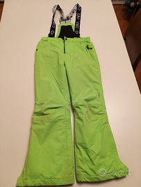 Pantaloni salopette da sci, marca CMP, modello Feel Warm Flat 5000, nuovi, caldissimi, colore verde lime. Bretelle regolabili, tre tasche zip. Adatti per un età tra i 8 e i 12 anni per un'altezza massima di 155 cm.
