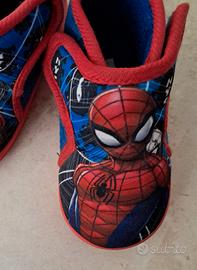Pantofole/scarpette con stampa Spiderman ottime da casa/asilo, misura 20. Molto morbide e pratiche da indossare grazie all'apertura a strappo su entrambi i lati. La suola è in gomma antiscivolo.