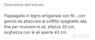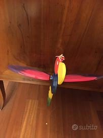 Pappagallo in legno colorato con dei fili che si tirano per farlo muovere