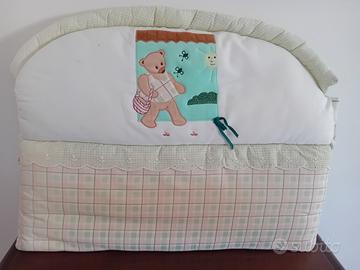 Vendo paracolpi con imbottitura in cotone per culla, fantasia molto carina, fondo verde chiaro, impreziosita da inserti di merletto. Abbinato il piumino. Conservati benissimo, come nuovi. Picci.
