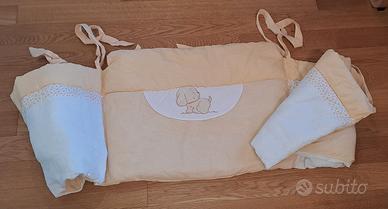 Paracolpi e trapunta per lettino, colori bianco e arancione tenue, con disegni di cagnolini. Le parti bianche permettono di essere ricamate. Usato ma tenuto bene.