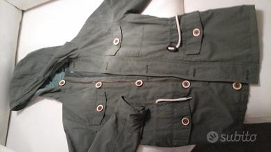 Ottima fattura per un capo per bimbi. Tessuto morbido sia internamente (azzurro a piccoli fiori nel cappuccio) che esterno (verde militare). Bottoni in legno a contrasto e cerniera.