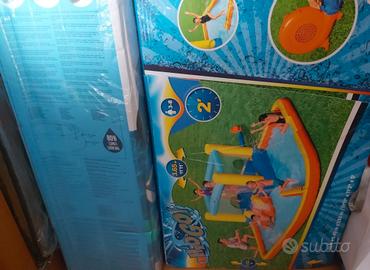 Vendo fantastico parco acquatico gonfiabile Bestway H2OGO!, nuovo e mai usato (ancora in scatola originale). Ideale per far divertire i bambini in giardino durante l'estate. Il parco include diverse aree gioco: scivolo, zona salto protetta da pareti in rete e vasca d'acqua. Dettagli principali: Dimensioni: 3.65m x 3.40m x 1.52m (molto spazioso). Montaggio ultra-rapido: Si gonfia in soli 2 minuti grazie al compressore/soffiatore elettrico incluso nella confezione. Età consigliata: Indicato per bambini dai 3 agli 8 anni (come riportato sulla scatola). Materiale: Poliestere rivestito in PVC resistente e colorato. Il prodotto è completo di tutti gli accessori originali (soffiatore, picchetti di fissaggio e kit di riparazione). Prezzo di listino: oltre 250€. Prezzo richiesto: 200€ (poco trattabili visto che è nuovo).