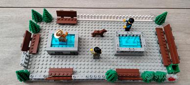 Vendesi parco-giardino pubblico formato da basi grigie rialzate, 3 minifigure (di cui la statua oro, in onore ai vigili del fuoco, abbastanza rara), cane, fontane, panchine e tutto quello che si vede in foto. perfetta per ampliare la vostra città lego. prezzo trattabile. Altri set e materiale Lego in vendita in altri miei annunci.