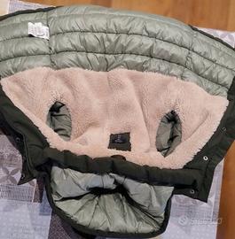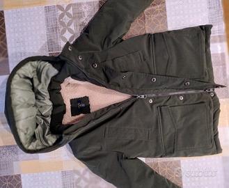 Parka imbottito per bambino a collo alto. OVS taglia 4-5 anni, 110cm. Verde militare con cappuccio e fodera interna in pelliccia sintetica. 4 tasche con bottoni sul davanti. Polsi con elastici. Chiusura con zip a scomparsa e bottoni.