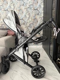 Duo passeggino anex modello e/type colore grigio chiaro tutto come nuovo a parte qualche graffio sulla struttura e sulla borsa porta oggetti come dimostrato dalle foto… compreso di borsa zanzariera e cappotti a per la pioggia