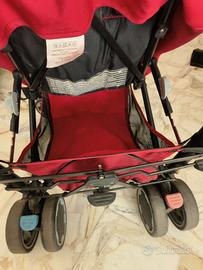 Passeggino per bambini rosso pieghevole e leggero, con copertura per la pioggia, in buono stato.