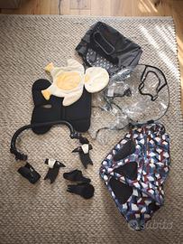 Passeggino e navicella bugaboo bee5. Buon stato, con tanti accessori, si è raccomandato come buona navicella e dopo il passeggino, ci sono attacchi per navicella cybex da macchina. Le maniglie sul passeggino non danneggiata la maniglia, appoggio, per bambini in ottimo stato. Unico difetto si vene sulla ultima foto, non porta nessuna disfunzione dell'uso, si si vuole si può comprare a parte.