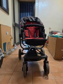 Ruote anteriori piroettanti con sistema di blocco/sblocco, freno sincronizzato, davantino removibile; cinghia a 5 punti, spallacci imbottiti, cappottina estensibile e cestino portaoggetti.
