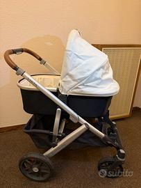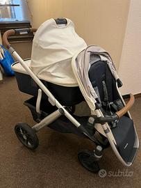 Passeggino Uppababy Vista trio con due sedute passeggino e una navicella culla, intercambiabili nelle varie posizioni per uso fratellare o gemellare. Completo di tutti gli accessori e gli adattatori per comporlo nelle varie configurazioni (navicella+passeggino o doppio passeggino, rivolti frontalmente o verso il genitore). Da neonati a 3/4 anni (15 kg).