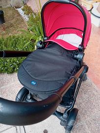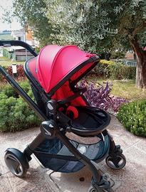 Impermeabile integrale, base rigida per navicella, imbottitura interna per navicella, cestino, tasca in rete, parafanghi per ruote posteriori, imbracatura per spalle, separa gambe imbottite, adattatori per rialzo e borsa extra con disegno di orsetto (questa di altra marca)