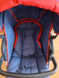 Passeggino con doppia fodera una invernale e una estiva,con copri gambe. Ha tre inclinazioni e un grande cestello . le ruote sono come quelle delle biciclette con camera d'aria, molto comode sulla neve.