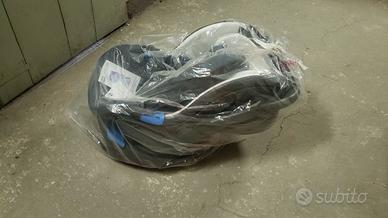 Passeggino Chicco trio con ovetto completo di base auto, navicella, passeggino. Colore blu e grigio con cucitore rosse.