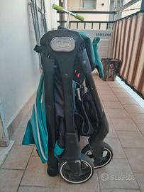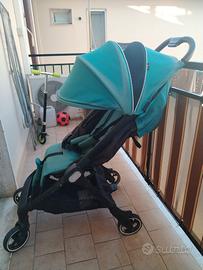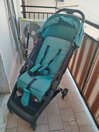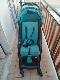 Passeggino We della Chicco, colore petrolio regge peso fino a 22 kg, leggerissimo, chiusura a libro, chiuso rimane molto compatto, fatto apposta per viaggi in aereo con trasporto in cappelliera. Robusto, con parasole allungabile tramite retina interna, portaoggetti abbastanza capiente e poggiapiedi regolabile. Schienale regolabile in varie posizioni. Compresa sacca a zaino per trasportarlo e cerata parapioggia.