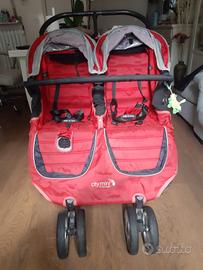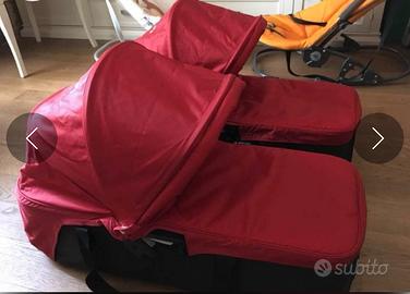 Vendo passeggino gemellare rosso,completo di due navicelle,barra frontale e telo parapioggia. Ottimo passeggino,molto robusto e maneggevole.