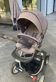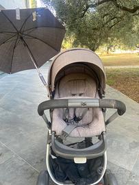 Passeggino reversibile posizionabile davanti alla mamma o verso la strada completo di ombrellino staccabile, e navetta grande utilizzabile fino a 6/7 mesi. Alla navetta si può applicare sempre l’ombrellino. Le ruote hanno il porta bicchiere. Compreso il sacco nanna nello stesso colore grigio mélange mai utilizzato.
