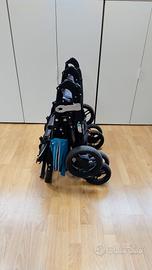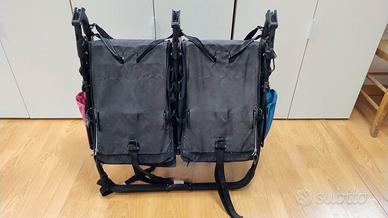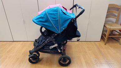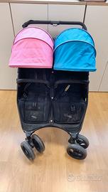 Passeggino gemellare affiancato Valco Baby Snap Duo colore nero con cappottine fuxia e azzurra. Il passeggino ha la gomma del maniglione rotta, ma è perfettamente funzionante.