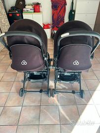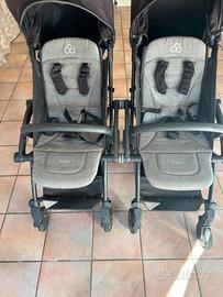 Due passeggini identici neri e grigi che si attaccano con una calamita e si dividono con un click. Ideale per gemelli
