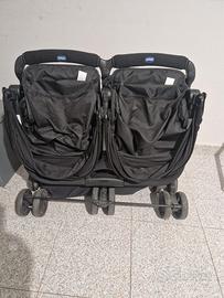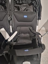Questo passeggino è il Chicco OHlalà Twin in colore Black Night, noto per essere estremamente leggero, pesando solo 8 kg, ed è dotato di una chiusura compatta attivabile con una sola mano.