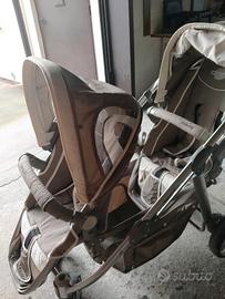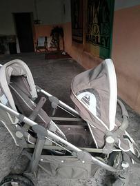 Passeggino gemellare completo di tutti i suoi accessori. Due ovetti, due cullette due passeggini , possibilità di montarle in diverse posizioni. Borsa porta oggetti. Usato ma tenuto molto bene. Regalo cappottine per la pioggia mai usate e ulteriore rivestimento per ovetti in cotone.